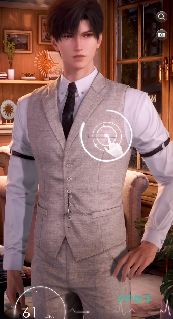 2、点触互动。玩家可使用长按、拖曳、轻敲等触摸方式与屏幕中的男主互动,点击不同部位均能触发语音以及对话。比如长在主界面,长按他的胸口,可以调出心跳模式,感受心跳频率。