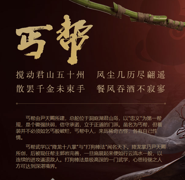 关于丐帮相关的玩法介绍就这些了,总的来说,丐帮的输出高、机动性强,但是控制力较差,不适合群体战斗。操作灵活的玩家们很适合丐帮,但是也要熟练丐帮的技能和连招,可以在竞技场轻松胜出。