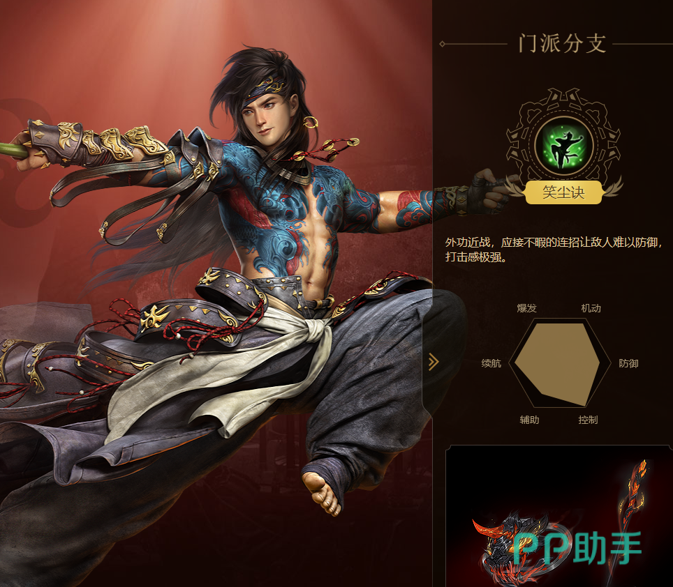 丐帮只有笑尘诀一个心法,没有分支,很适合与敌人近战,有很多连招,敌人难以还手。丐帮以“打狗棒法”和“降龙十八掌”出名,连续的进攻让敌人应接不暇。丐帮的近战能力很强,伤害很高,而且有极强的控制力。虽然丐帮的单人作战能力强、控制高,但是对于群体作战没有优势。