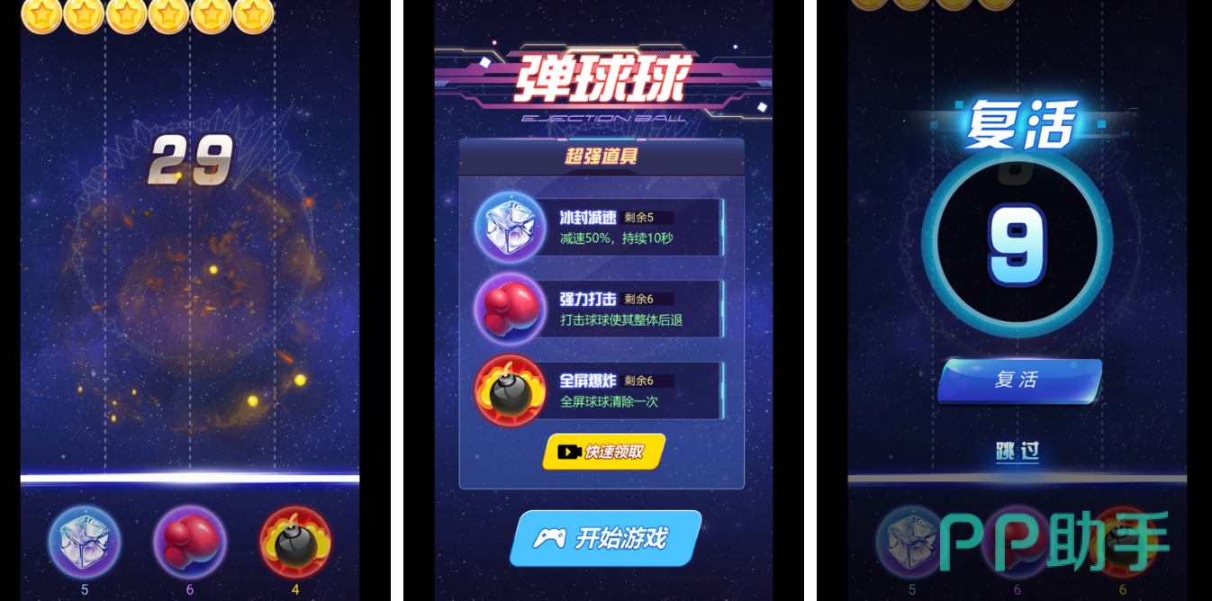 这回你要打掉的是星星啦,连游戏的背景都是梦幻感十足的星空,随着游戏的进度,星星们会逐渐的逼近,你要赶快用弹球将它们消除掉,游戏会提供一些强力的道具,比如可以引爆全屏的炸弹,或者提高打击力的的拳击手套,还能冻住逼近的星星们,这些道具平时要注意领取,关键时刻就能用的上了。