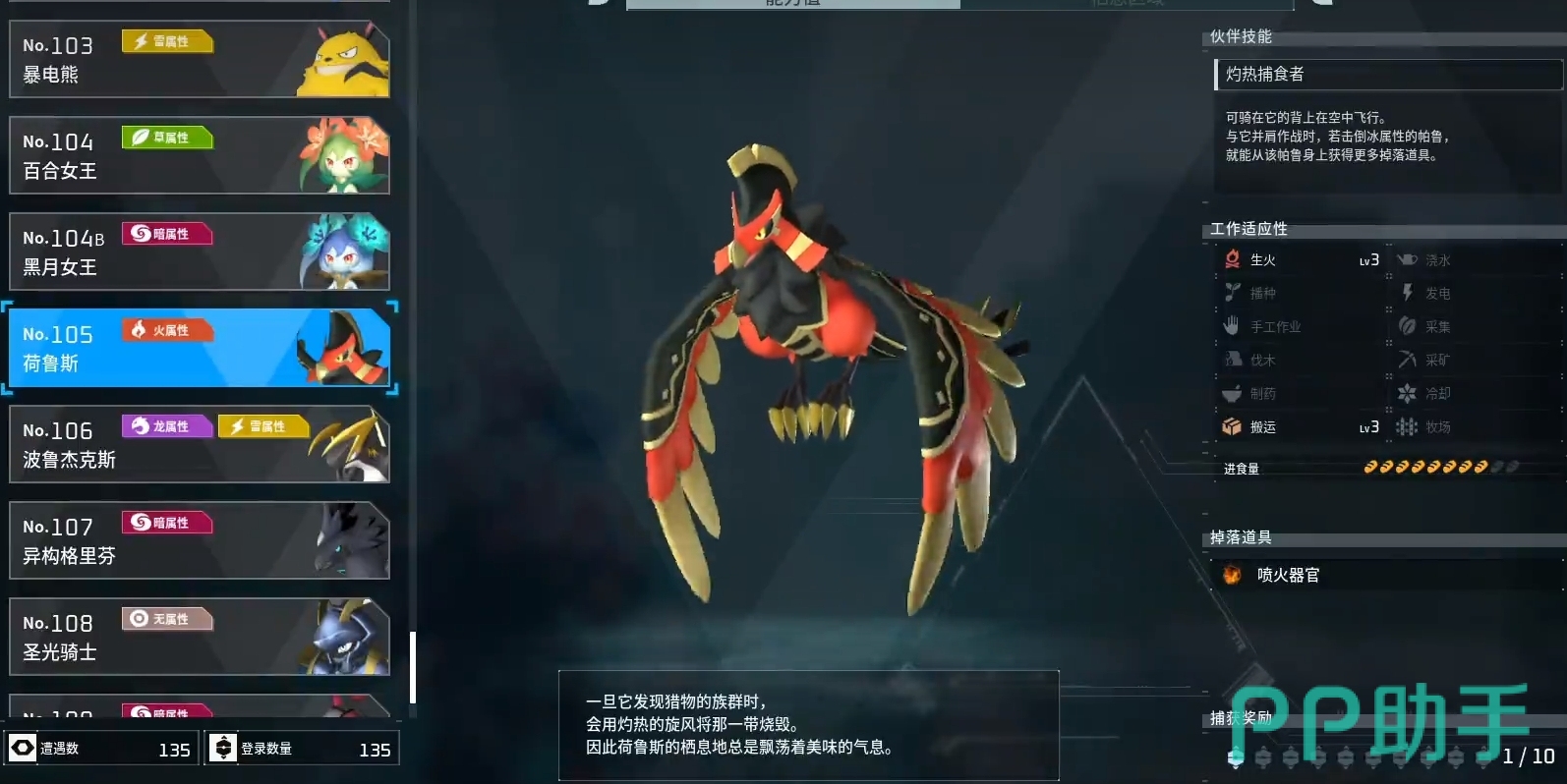 荷鲁斯是一只火属性的鸟类帕鲁,它编号105,分布的位置其实和异构格里芬一样,都是打开初始地图,然后前往右上角的小岛去找即可,它的分布非常广泛,属于一个十分常见的存在。