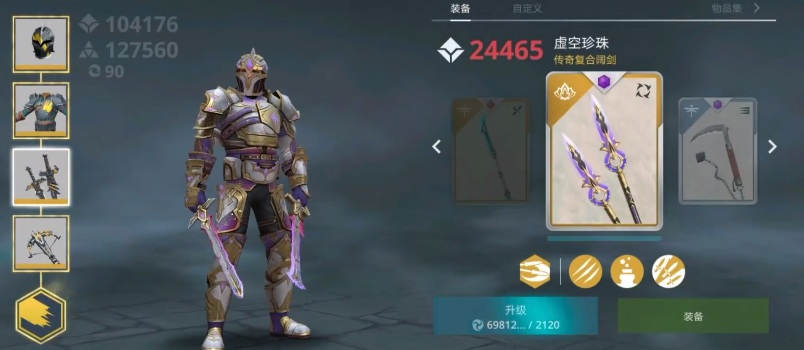 虚空珍珠:单独的复合阔剑武器,有着漂亮的荧光紫珍珠装饰,特点就是4%的暴击非常高,拥有特殊暗影技能飞天环转,但是因为没有其他伤害的加成,暴击过高反而容易断连招。