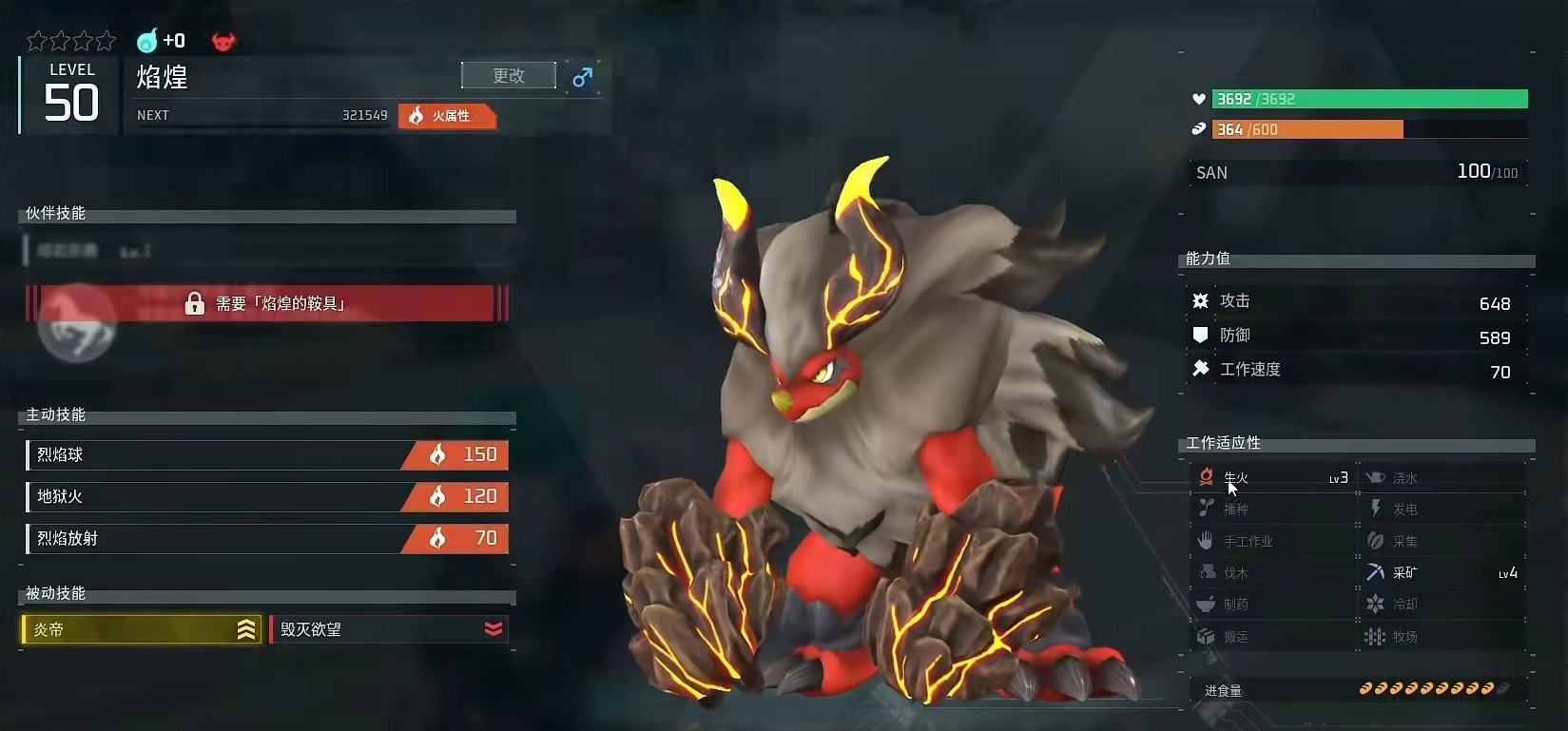 要想找到焰煌,大家需要传送来到火山之路,然后召唤出自己的飞行坐骑开始赶路,穿过一个巨大的雕像之后来到黑曜火山,在这里找到灼热坑道,进去之后就可以找到了。在捕捉之后就可以看到该宠物主要特点,主要技能烈焰球,能够在自己的头上生成巨大火球,向敌人发射命中之后造成爆炸伤害,伤害范围非常大。还有地狱火、烈焰放射这样的技能,烈焰放射能面向敌人释放火焰,造成持续伤害,地狱火是使周围的地面活性化,并在一定时间后爆炸。在工作的时候,可以带来三级生火和四级采矿,这样的工作能力可以给大家带来极大帮助,是非常出色的劳动力。