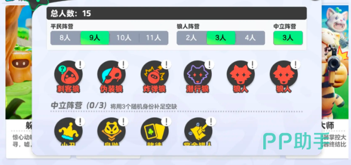 新增的15人模式其中9个角色是平民,3个为中立,3个为狼。之前有的小伙伴总是觉得狼人杀可以玩的人数不多,现在15人想必已经足够大家去拉上大部分的小伙伴一起去体验了。