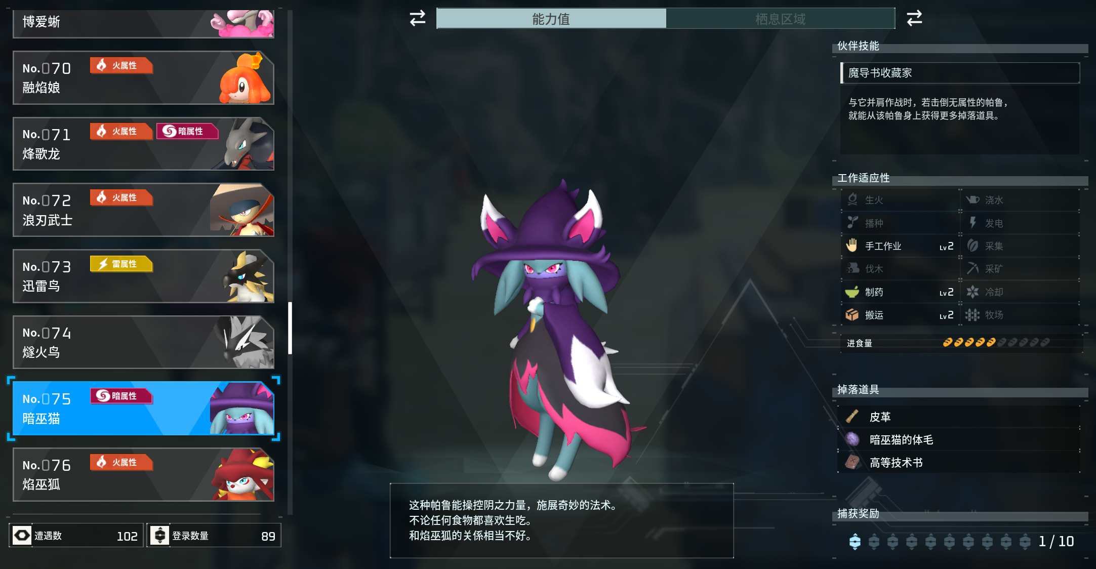 暗巫猫的捕捉位置并不固定,它会出现在一些阴暗的地方,比如森林、洞穴、废墟等出现概率也不高。这种就纯碰运气的。但是大家也可以在右侧的固定刷新点来获取。这里面的暗巫猫还是个领主属性的,非常值得一抓。抓暗巫猫与其他帕鲁类似都是最好压低血线在上一些比如麻痹、中毒之类的debuff,这样可以增加玩家的捕捉成功率。而且大家注意一下,技能书是后面箱子拿到的,本身暗巫猫不会固定刷出技能书。
