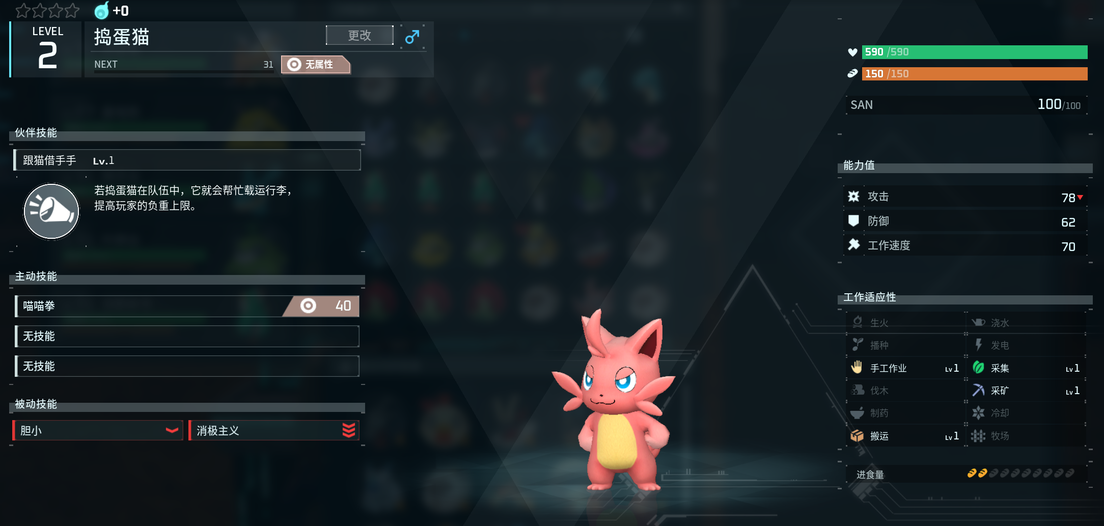 配种的基本原理是,玩家需要在配种牧场中放置两只幻兽,然后等待一段时间,就有可能产生一只新的幻兽。而配种农场可以在科技树中解锁,每个配种牧场可以同时放置两只幻兽,玩家可以建造多个配种牧场来提高配种效率。配种的结果受到多种因素的影响,比如幻兽的种类、性别、亲和度、等级、品质、技能等,不同的组合会有不同的概率,有些组合甚至会产生稀有的幻兽。而捣蛋猫就是一个非常靠谱的基础型帕鲁,它能将携带的优良特性遗传给下一代,下面我们就来看一下。