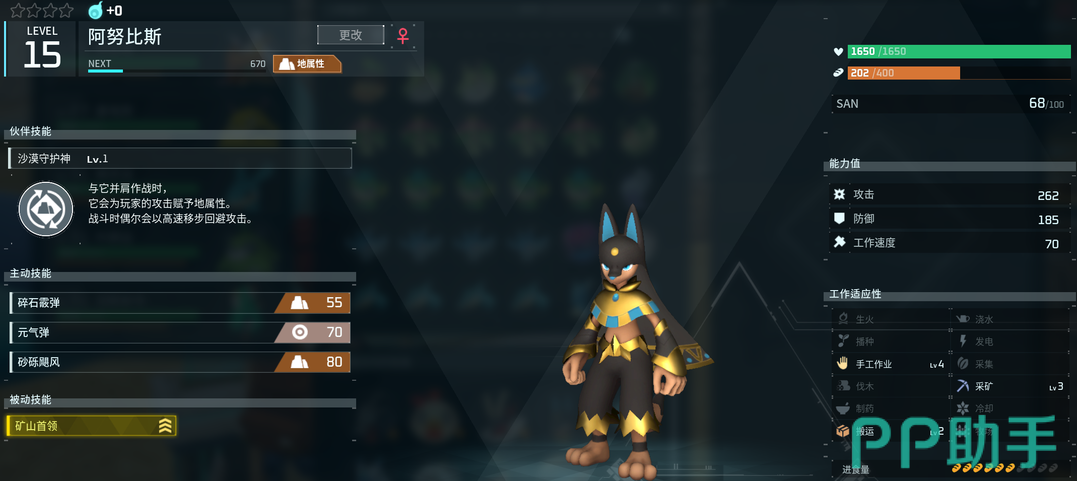 第二种方法是使用阿努比斯和电棘鼠进行配种,这两种帕鲁都比较强力,但也比较难得。你需要先合成出一只阿努比斯,它的合成路线有两条,一条是使用棉悠悠和波路杰克斯合成疾旋鼬,再和女皇蜂合成阿努比斯、另一条是使用猎狼和空涡龙合成阿努比斯,这样可以遗传到传说词条。电棘鼠则可以在沙漠地区找到。这公式的好处是顺手拿到阿努比斯,这是手工*4的超强打工仔,非常推荐这种合成方法。