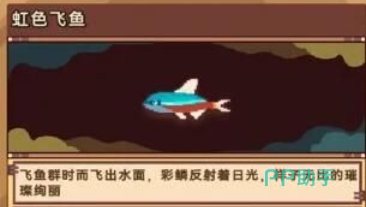 虹色飞鱼:顾名思义是一种会飞起来的鱼类,这类鱼会从水底窜出来跳成一道彩虹的弧线然后落入水中,因为身体的颜色比较多,看起来就像彩虹一样,跳起来还可以反射出日光的光线,身体长度也比上面的两类鱼长。