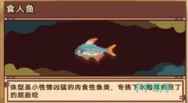 食人鱼:是外形看起来比较娇小,但是实际性格非常凶猛的鱼类,会在有豆丁下水的时候去追着豆丁妖,身体颜色比较多,长度不算长,但是牙齿锋利,豆丁下水嬉戏的时候要多注意。