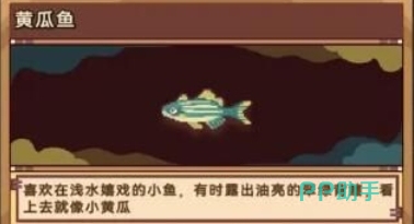 黄瓜鱼:是一个可以在浅水区域中钓上来的鱼类,颜色呈现翠绿色,所以看起来比较像一条小黄瓜,在水中玩家有时候也可以看见这种鱼类漏出水面的背脊,身体长度比较短。