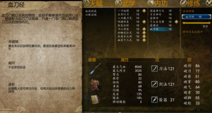 血刀经是血刀老祖的独门秘籍,后来传承给了狄云,在游戏里大家在赛王任务后就可以获得这本功法。小编首先推荐的是把血刀给了二师兄雁行。虽然二师兄连斩的技能在学习血刀功后由于机制的问题不能再用连斩,但是血刀功带来的属性增益远超连斩带来的伤害。所以还是可以带血刀的。