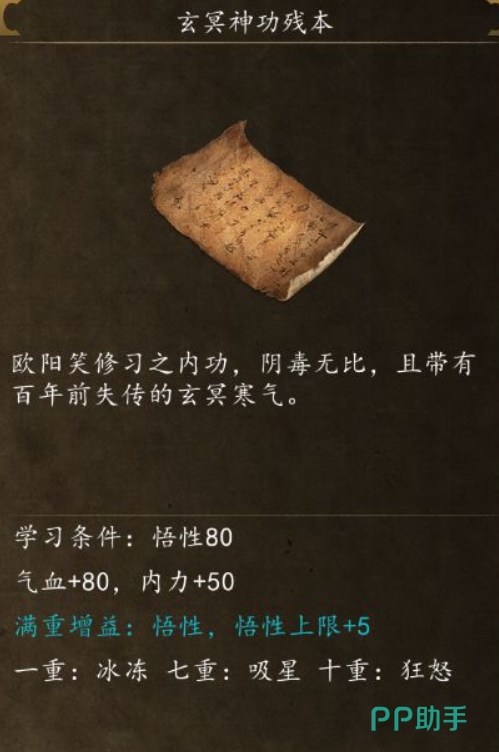 玄冥神功的一重功力可以有冰冻效果,可以给大师兄装备上,因为这个冰冻效果可以对敌人造成控制效果配合大师兄的高输出能力在战斗中有奇效。并且学习这本功法的悟性需要很高,大师兄的悟性超过八十真好可以学会这本功法。