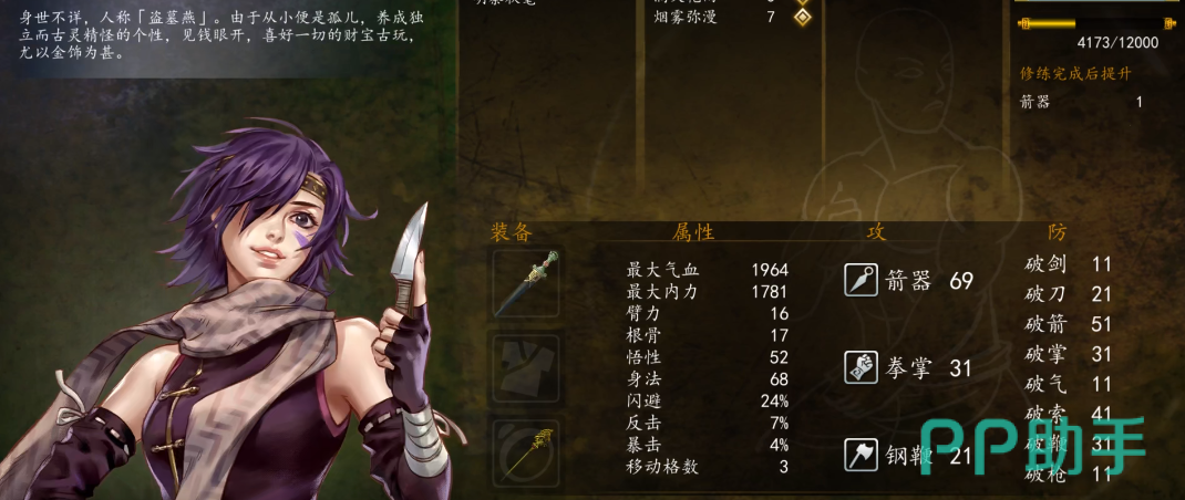 史燕的作用是可以帮助玩家偷窃一些物品和秘籍,她有一个专属的武功,叫做荆轲武诀,可以让她在战斗中偷取敌人的物品,有时候可以得到一些稀有的物品,比如武功秘籍、装备、药品等。史燕还有一个专属的天赋,叫做盗贼之王,可以让她在大地图上偷取一些物品,有时候可以得到一些有用的物品,比如金钱、食物、材料等。史燕的偷窃能力是游戏中最强的,可以让玩家省下不少的金钱和时间,获取一些难以获得的物品和秘籍。