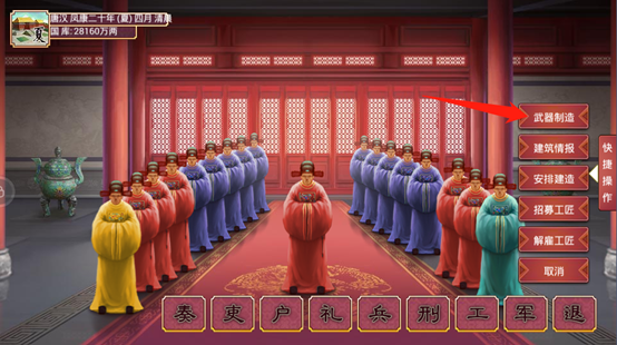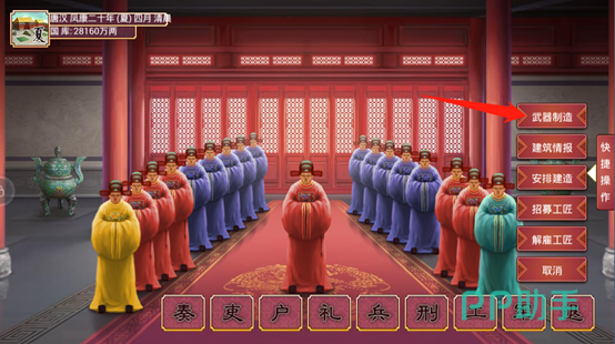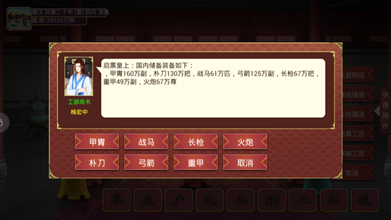 想要让工部多多建造武器,那么工部大臣的智慧和道德一定要高。智慧高可以帮助国家建更多武器。道德高可以防止官员贪污。