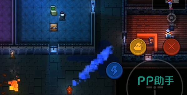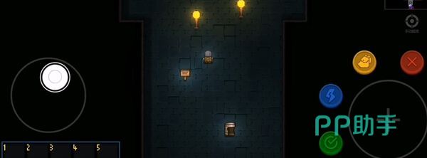 黄色的是背包,点击可打开背包,长按背包中的物品还可以将其拖到工具栏里面,红色的是退出,蓝色的代表技能,有部分角色还有专属于自己的技能。大图标是攻击键,可以通过转轮方向来确定角色的攻击方向,需要玩家多去熟练一下,不然很容易打歪,多加操作可以增加熟练度,掌握之后就非常方便了。