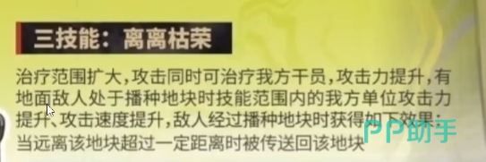 最后的三技能“离离枯荣”则是扩大治疗范围,并在攻击时可同时治疗己方干员,以及提升他们的攻击,而且这招还能播种地块,以此在队友经过时提供攻速和攻击力增益,在敌人经过时令其移动一定距离后被传送回来。