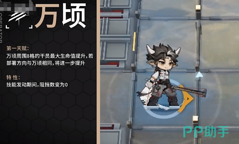 万顷的天赋能够让他附近八格内的队友都获得额外的最大生命值提升,相当于直接加强了队伍的整体坦度,而且这些队友如果部署方向与万顷一致的话,那么血量还会额外进行提升,积少成多之下,队伍的整体坦度会直接达到一个全新的高度。