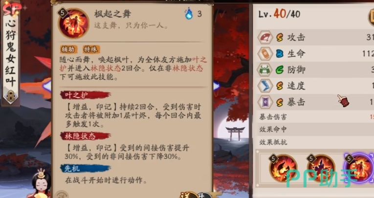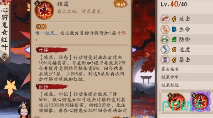 叠加到5层满层后还能施加红蚀,以此降低50%的行动条提升效果,并使目标被红叶攻击后额外承受一次120%攻击的间接伤害。