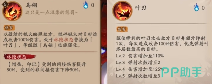 一技能是“乌翎”,效果是对单体敌人造成百分百攻击的伤害,处于林隐状态则将技能替换为叶刃,叶刃可以攻击敌人并进行额外弹射,相当于能打两次100%攻击力的伤害,而且它会优先弹射叶烬层数最高的敌人。