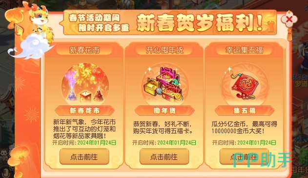 新春贺岁福利:活动期间会开放“新春花市”,“囤年货”和“集五福”三种奖励,花市里可以买到具有春节气息的各种新品家具,年货则是通过购买年货以此获取五福卡,集齐五福后则能够参与五亿金币的瓜分。