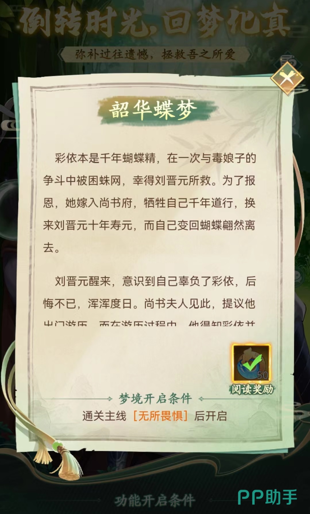 尚书夫人让他去出门,游历在游历过程中得知彩衣并未离去,所以才来找李逍遥相助,这就有了韶华蝶梦的故事。要想开启这项玩法,需要先通关主线无所畏惧,接下来就可以在这里找到了。之后玩家可以在已解锁剧情节点,重新进入回梦任务体验,并可随时进行切换,这样就能达到不同结局。不同结局会有不同奖励,将所有结局全部完成之后,就能获得最终奖励。另外该活动难度将会根据通关结局进行动态调整,最高也不会超过最终结局难度。