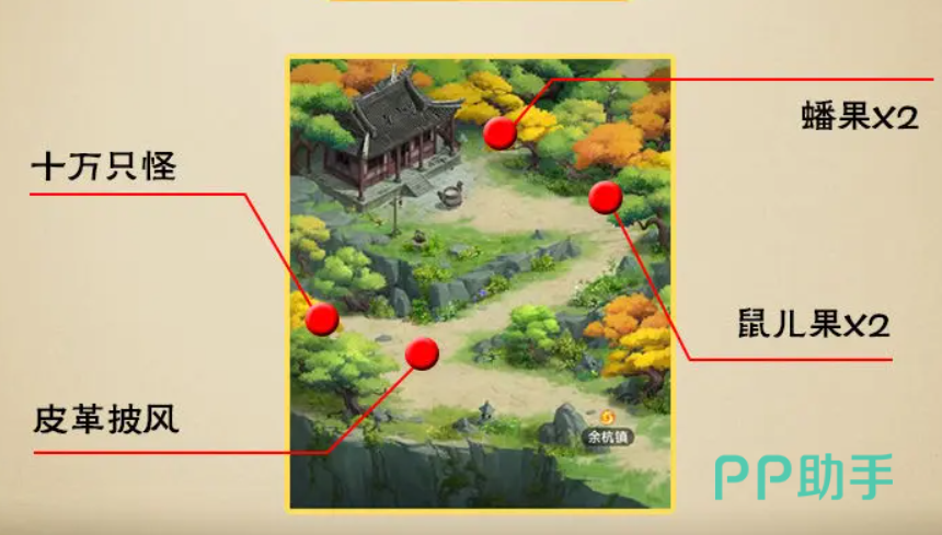李逍遥的房间里有2处发光的点可以得到1个蟠果和2个鼠儿果,这里不详细截图展示了。重点是客栈一层的几个隐藏点。从左到右可以得到5个鼠儿果,进阶到仙剑李逍遥后和婶婶对话得到1个通灵符,在于婶婶好感度对话达到2级之后,用任意李逍遥和婶婶对话可以解锁隐藏成就“寸草春晖”。十里坡那里也有4个隐藏点,从左到右分别是十万只怪、皮革披风、2个蟠果、2个鼠儿果。