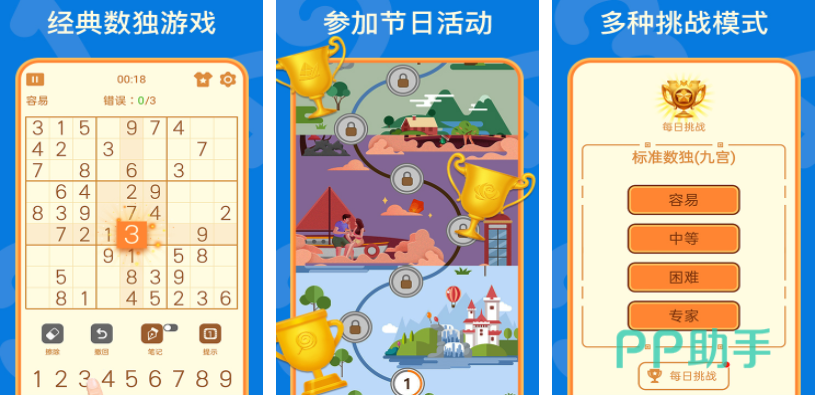 数独!是款画面非常精致的找规矩解谜游戏,九宫格、四宫格等不同难度的解谜关卡令人沉迷其中,自由选择难度的设定也让这款游戏显得非常良心,多样化的辅助道具和轻松愉快的游戏氛围让人爱不释手,精致的卡通向美术风格和独具创意的点触式玩法吸粉无数,更有不少节日活动任务期待着数独高手们参加!