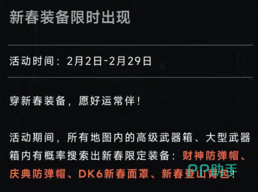 从2月2号开始,一直到2月29号结束,所有游戏的地图里,小伙伴们若是找到了高级武器箱或者大型武器箱,都有概率会得到新春的限定装备,包括新春特别制作的登山背包、DK面罩、财神防弹帽、庆典防弹帽等等。
