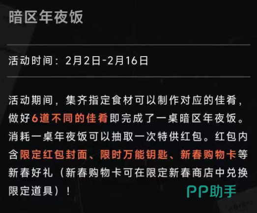 限定商店在这期间也会出现,小伙伴们可以收集限时出现的新春购物卡,只要登陆就能领取,可以兑换丰厚奖励。此外还有新春水饺以及年夜饭,其中水饺可以兑换购物卡还有武器自选礼包等等。至于年夜饭,只需要大家收集好要求的食材就可以制作出年夜饭,成功之后能够抽取一次特供礼包,里面包含了限定的红包封面、现实万能钥匙以及新春购物卡等等。