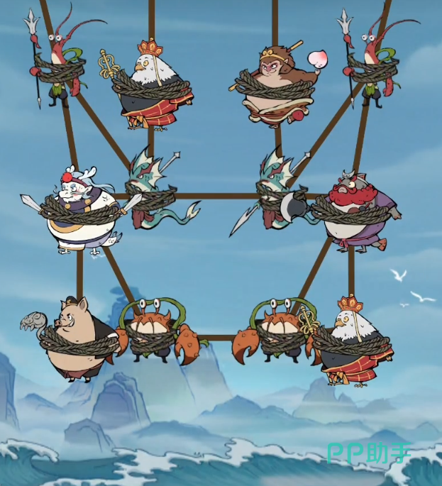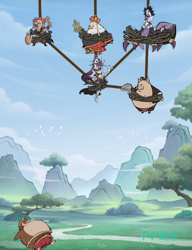 第一关是一个教学关卡,非常简单。玩家们只需要将唐僧头上的两个绳子全部减下来就可以了。第二关开始难度就有些有了,总共出现的师徒三人和妖怪三个,我们需要沿着唐僧的绳子来剪,最后垂直的时候一口气全部剪下来即可。
