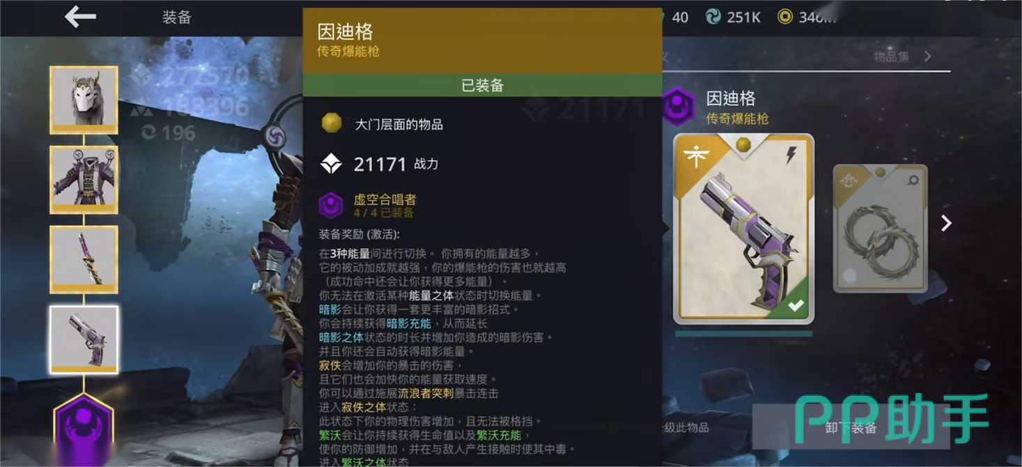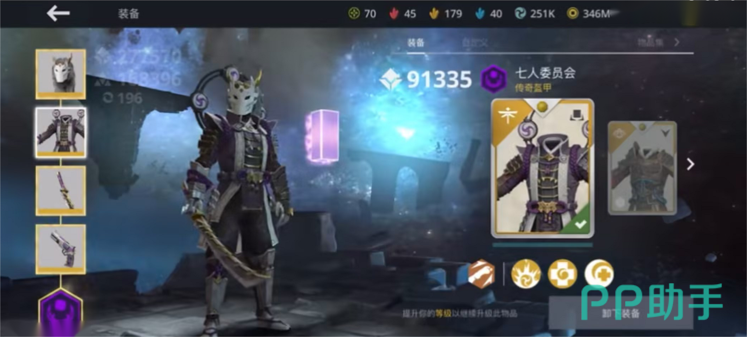 套装穿戴的是紫色的武士盔甲,拥有超高的防御性能还有帅气的武士外形,并且和武器一起可以凑够虚空合唱者套装,会比敌人多出一个技能,会比同水平的增加更多的胜率。