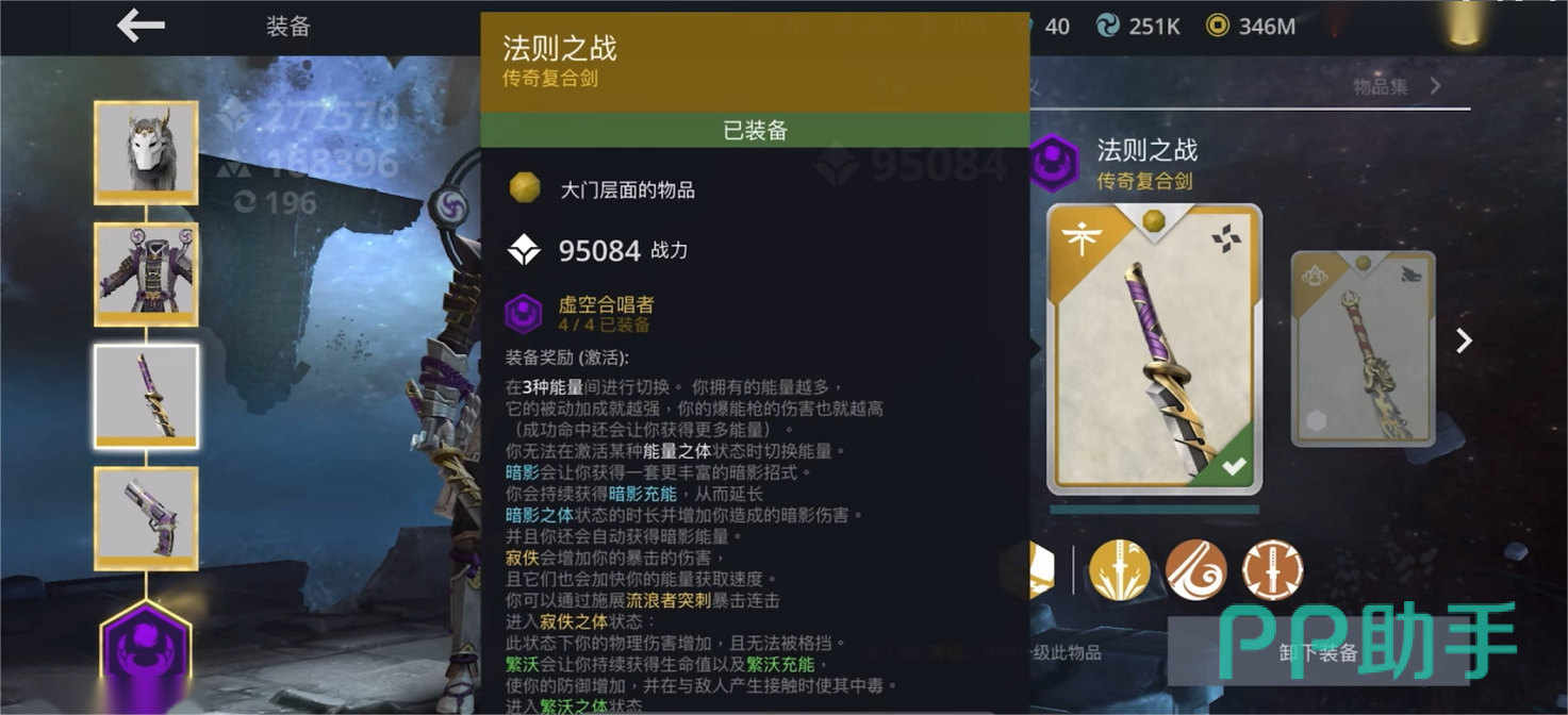 首先武器选择法则之战,是传奇品质的复合剑,初始属性的加成非常的高的同时还附带虚空合唱者套装能力,让你拥有更强的伤害还附带一个特殊的技能以及一个特殊的特效计算机制,让你在对战之中更具优势。
