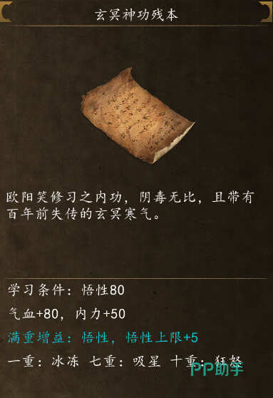 下面介绍一下侠客风云传前传玄冥神功残本,不少小伙伴还不知道这本功法的具体作用,它是之前欧阳修练习的一种内功,走的是非常阴毒的路数,练起来还带有玄冥寒气。如果小伙伴们没有得到这个玄冥神功残本的话,可以去寒冰洞找到欧阳笑跟他战斗,在战斗的过程中可以偷到这本秘籍,当然,把他打死也可以拿到。