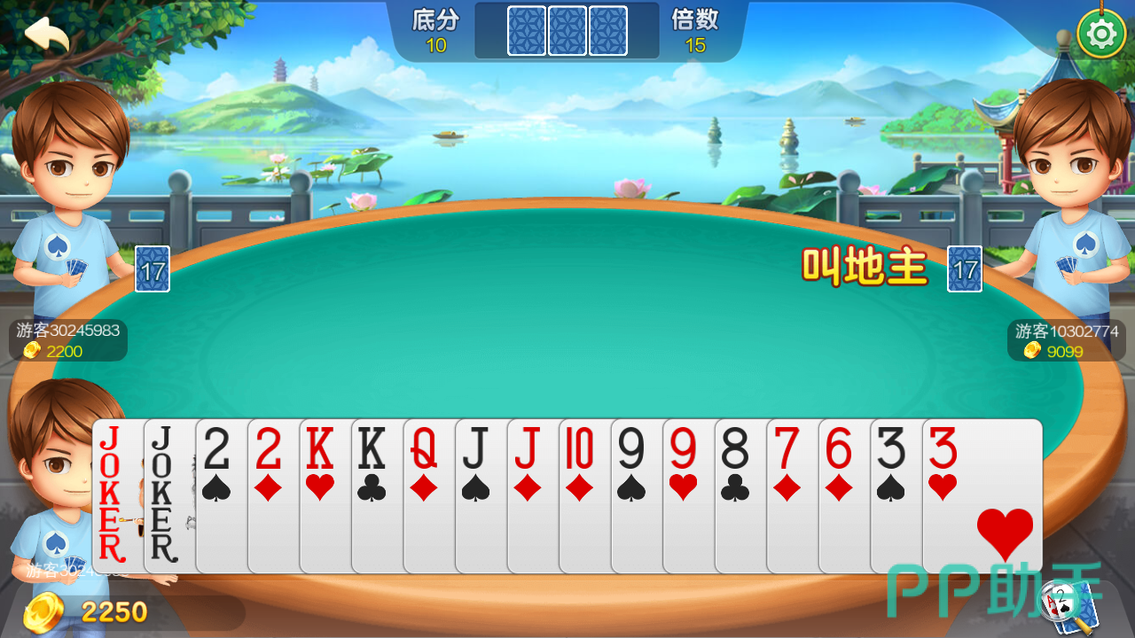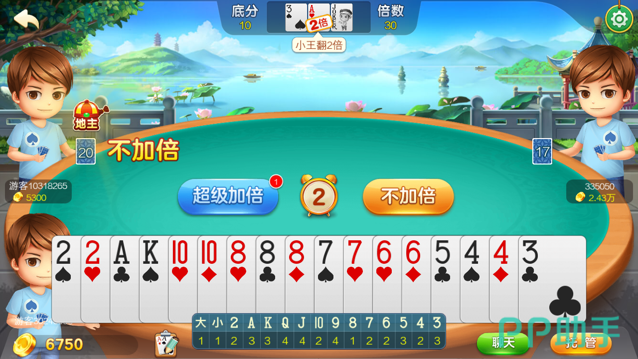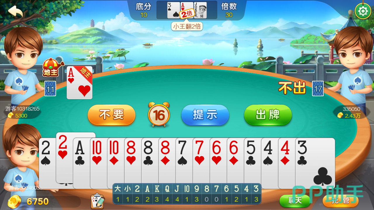 界面上方中间则是剩下三张,如果你抢到地主,剩下三张则归自己,且会因为不同的规则会有加倍。比如图中出现小王,则加两倍。