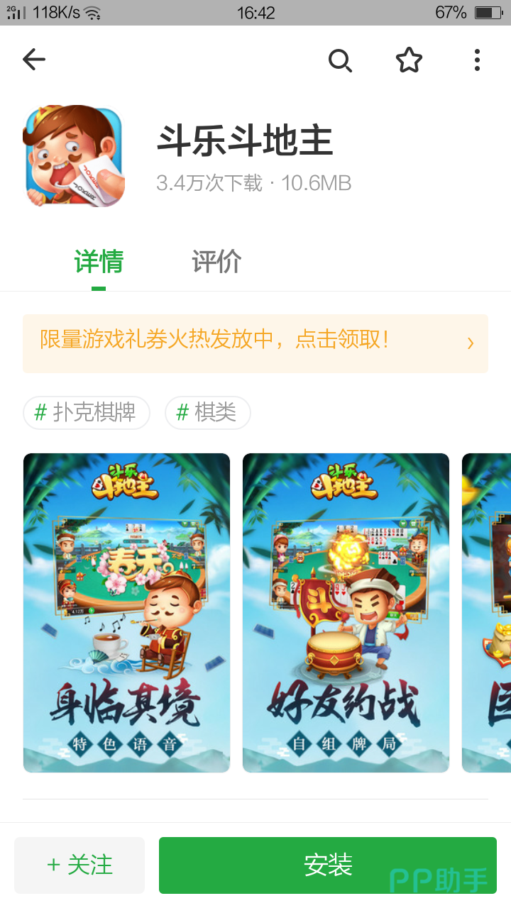 方法3:这个方法,主要针对已经下载豌豆荚APP的玩家。首先,打开豌豆荚APP,搜索斗乐斗地主,直接点击【安装】即可。