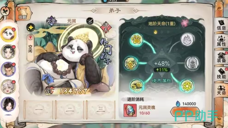 第一个值得培养的是【熊猫】。作为游戏的开荒期就拥有非常高五维属性的弟子,熊猫可以说是我们开荒路上的“六边形战士”。熊猫的战斗属性是非常强的,无论是解决宗门突发事件,还是野外战斗,我们只需要派出熊猫,他就能轻松胜任。所以小编推荐大家优先对熊猫进行培养。