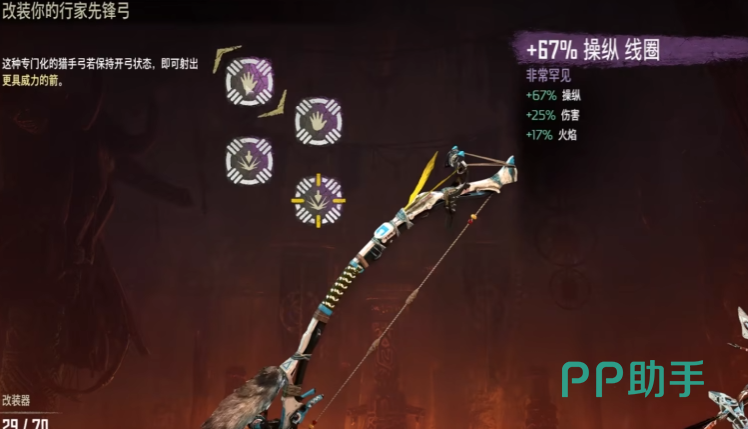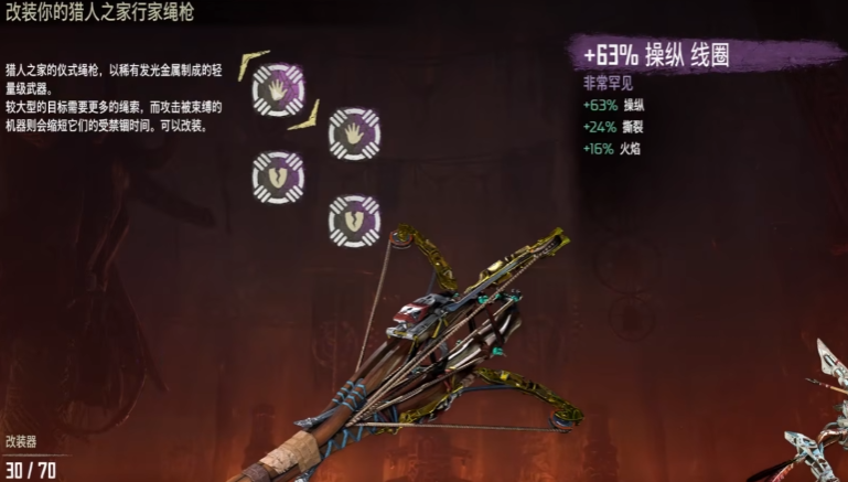 猎人之家行家绳枪,操控70~210,可以使用重型系绳箭矢,该箭矢撕裂150~375,主要是用来捆绑一些大型机械兽和飞行机械兽的。在打一些飞行机械兽的时候可以先在地面埋一堆爆炸物,然后将其捆下来后直接造成爆炸伤害。