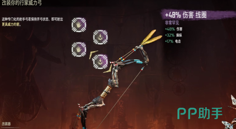 行家战士弓,操控50-150,有电击、冰冻、堕落这三种箭矢。电击箭的伤害在4-10,点击50-125,主要是打电击效果可以让敌人倒地不起。冰冻箭,伤害4~10,冰冻50~125,主要是打冰冻,可以让己方的攻击伤害加倍。堕落箭,堕落80~200,是唯一堕落武器,可以令对方无差别攻击所有的目标。建议开局直接三箭齐发这样威力巨大,不仅可以快速堆满对方的属性槽让对方很快陷入属性状态 。