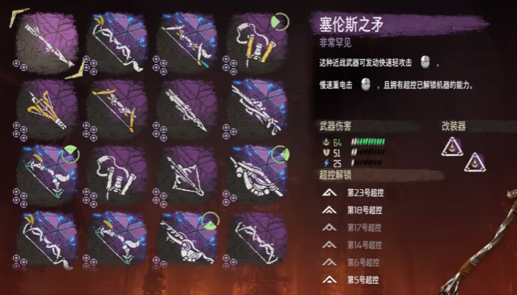 塞伦斯之矛,很罕见的一把武器,近战轻击发动迅速,并且拥有可以操控已解锁机器的能力,同时可以提升30%的长矛伤害。伤害一般是在40~64之间,撕裂51,电击25。这把武器的主要用途就在于可以操控机械兽。