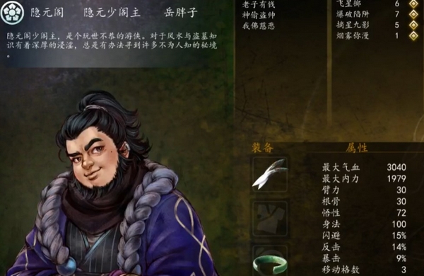 招募到的岳胖子其实是隐元阁的少主,后续大地图上出现隐元阁门人的相关事件时,还能找到对应的NPC购买一些秘籍功法,其中就包括先天功的残页,也是游戏里终极功法。