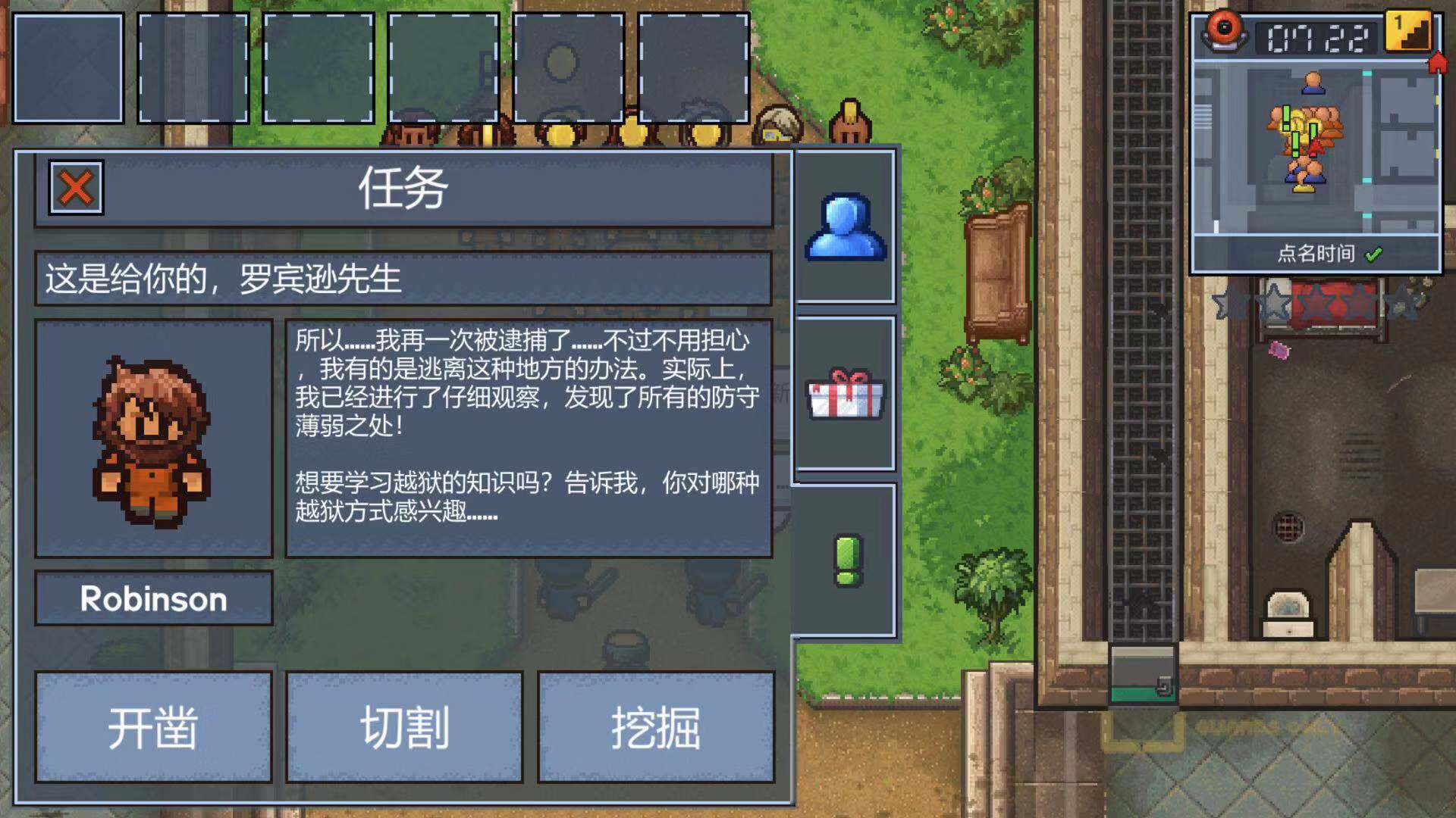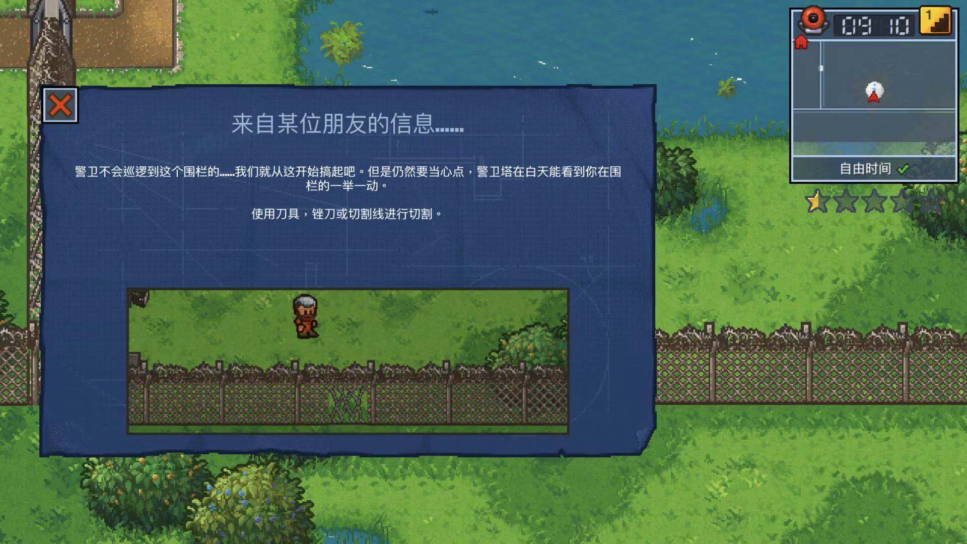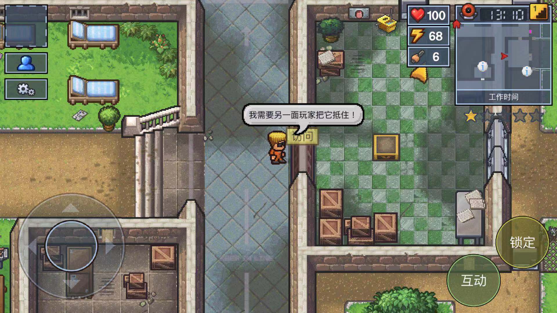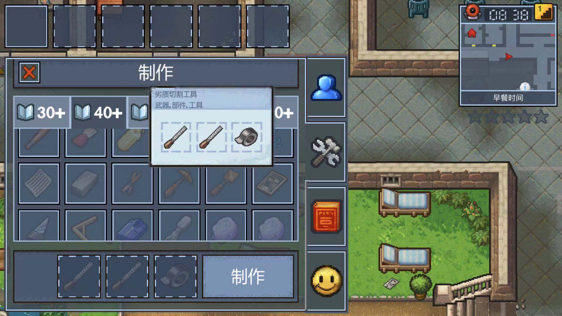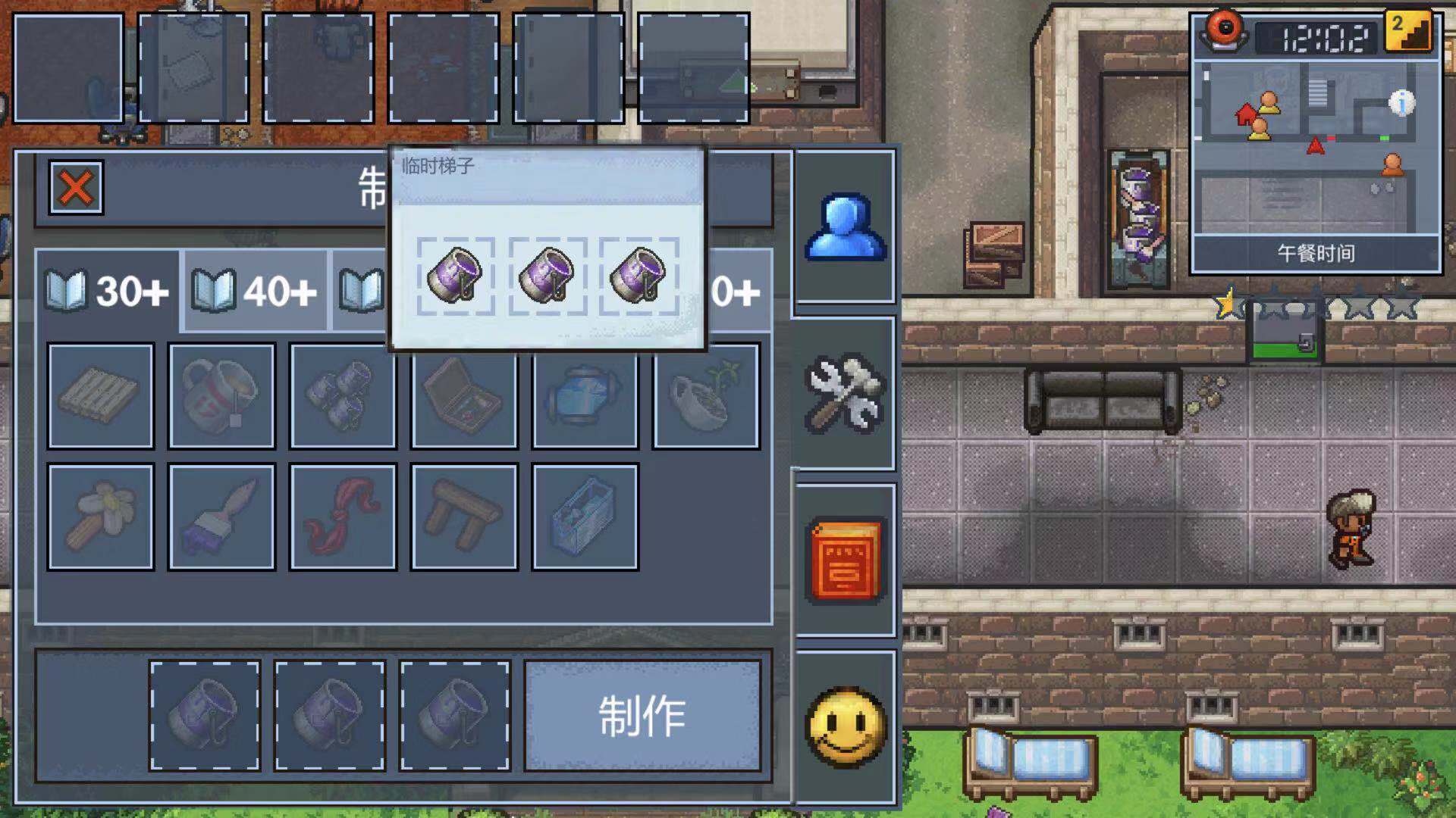 2.东西做好后我们就做个乖孩子,在监狱里老老实实的不要让警戒值上升或者星星等级上升,慢慢的等到夜晚的熄灯时间。(注意一定是熄灯时间不是回到牢房的时间)