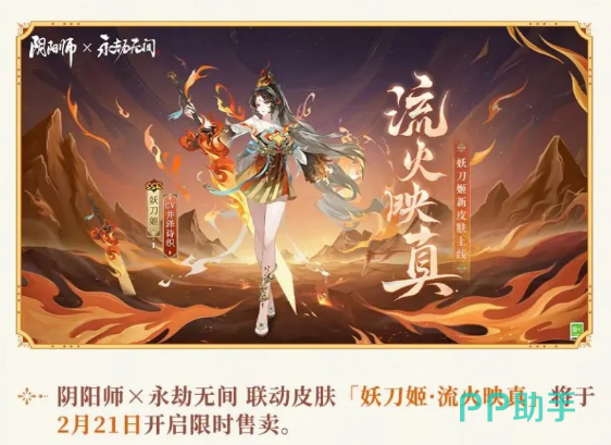 妖刀【流火映真】这款时装是独属于阴阳师和永劫无间的一款联动皮肤,这款皮肤会在2月21号正式上线并且开始显示出售!而且本次的充值活动还可以参加返利活动!同时商城中还会上架最低6元的系列皮肤,大家可以考虑冲一波!