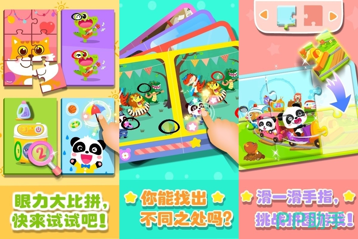 该作是一款以图片玩法为核心的作品,通过让孩子们将拼图拼回到指定的位置,来完成图片的复原。每张图片均会被分为六张拼图碎片,只要孩子们认真观察,便可轻松找准这些碎片的准确位置,所有游玩难度并不高,但能很好地帮助4至6岁的儿童开发智力,让他们感受到动脑的乐趣。此外,这款作品还有找不同等其它图片玩法,可以让孩子们换着来玩。