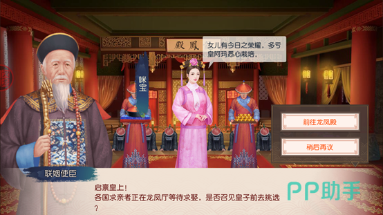 皇子们成年,经过品级鉴定后,各位皇阿玛们就可以为皇儿们招亲了。此时联姻使臣将会询问是否召见皇子前去挑选各国求亲者,此时点击前往龙凤殿,就可以为成年皇子赐婚啦。