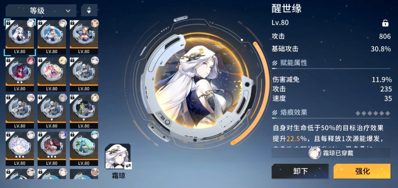 因为这个角色的护盾和治疗量都是与攻击力挂钩的,所以这个角色是需要堆攻击力的,而大招的冻结效果需要提前释放才能保护到队友,因此速度也是需要的。烙痕基本上就是选她的专属烙痕“醒世缘”了,属性方面都提升攻击力、按百分比提升基础攻击力刚好符合霜琼的需求。