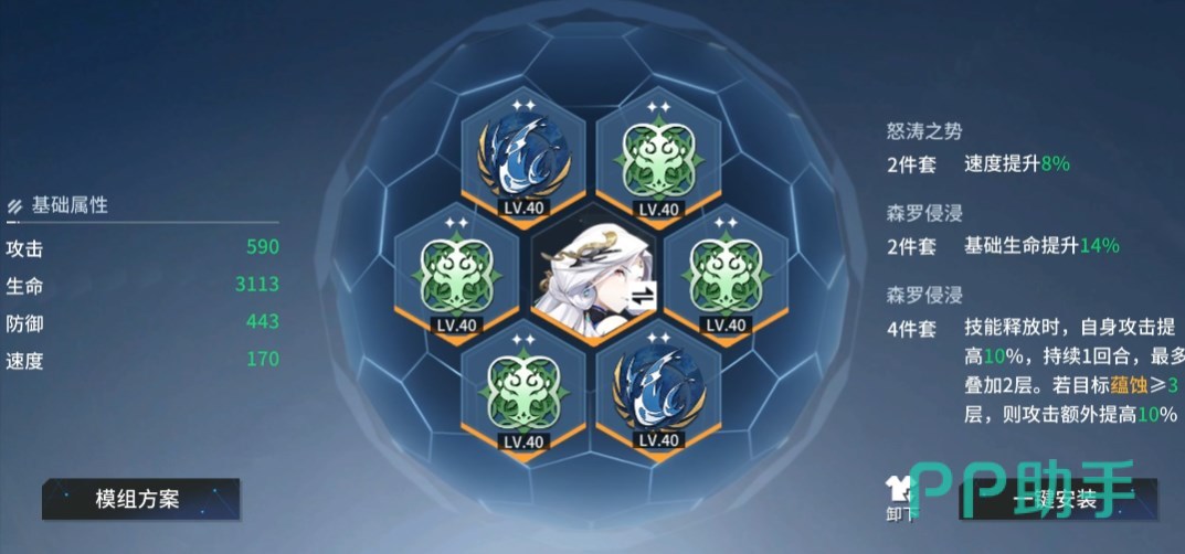选择烙痕很重要,但还需给烙痕正确的赋能,速度、攻击是首选,第三属性可以考虑一个自保向的属性,例如伤害减免。至于模组,一般是4森罗加2怒涛,4森罗除了加基础生命外在施放技能的时候可以提升自己的攻击力,怒涛则可以提升8%的速度。