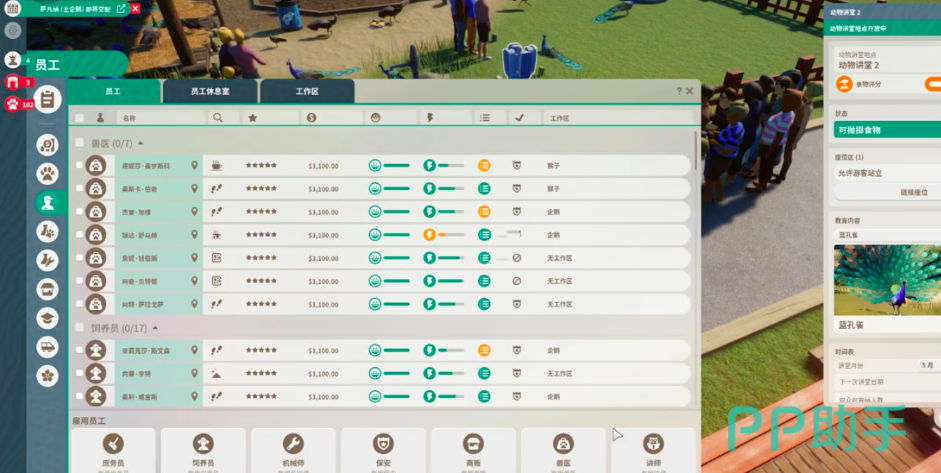 其实要想找到动物讲堂方法还是很简单的,玩家先进入游戏之后点击剧情,然后选择设施,然后点中媒体装置已与教育再点击全部集合,即可看见动物讲堂,而这个讲堂就是可以实现员工和游客进行面对面互动和各类动物知识讲解的重要地带,而在这个讲堂当中,玩家千万要记得一定要招聘一个专业的员工,也就是动物讲堂的讲师,因为这个讲堂是要配合着讲师才能够启动使用的,在讲堂当中分为景物评分,可包制食物和允许游客站立这几大部分,而在可抛掷食物当中,玩家需要设定动物们爱吃的东西,才能够吸引他们前来进食,这样也更便于讲师向游客展示动物们的饮食习性,而要从整体游戏的本质来看,通过这种动物讲堂,像动物炮制食物也可以降低饲养员的饲养压力。