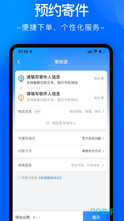 该软件及寄件查件运费等功能为一体,是线上售后时效查询等综合快递物流服务平台具备的功能,有预约寄件,有指定小哥上门取件,让用户足不出户就能够把自己的快递寄出去,还具有快递查件以及地址管理运费时效等功能。