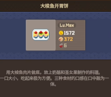 最后是第三道菜,这道菜叫做大梭鱼开胃饼,这个菜肴是由大梭鱼和圣女果、洋葱、蛋黄酱所做成的,这些材料和第一道菜的获取难度是差不多的,所以做起来同样是很轻松的。价格方面,可以卖到1600块左右,这个售卖价格也是相当高的,结合前面的材料来看,性价比也是杠杠的。