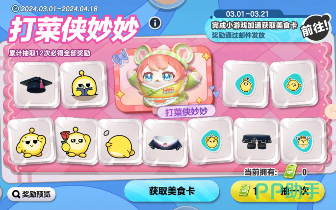 想要拿到打菜侠妙妙的话就要参与3月1日至4月18日之间的限时活动。在这段时间内,完成游戏内指定的任务是获得“打菜侠妙妙”皮肤唯一渠道哦!这些任务还是比较简单的都是我们在游戏中的各种挑战或者说完成特定关卡或达成一定的分数。在完成任务后会获得美食卡。这些卡片是参与抽奖的必要条件,玩家需要收集足够的美食卡才能进行抽奖。抽奖环节还是比较良心的,它不仅能让玩家获得皮肤,还有机会赢得其他游戏内物品。